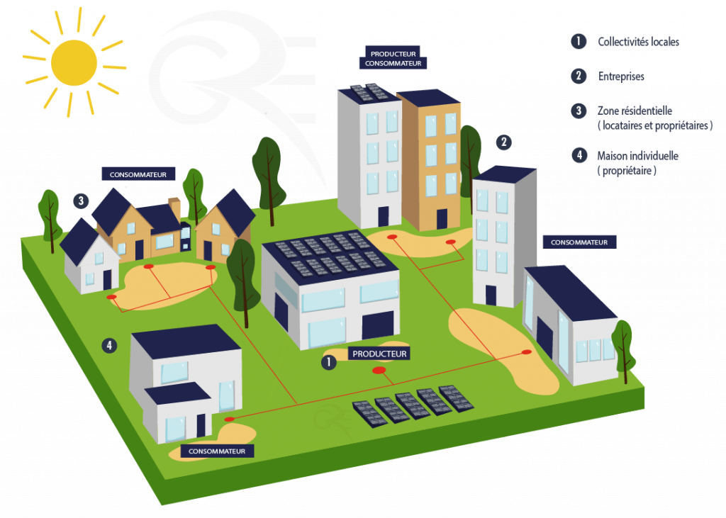 Contrairement à l’autoconsommation individuelle, où l’énergie solaire produite est consommée par un seul utilisateur, l’autoconsommation collective repose sur un regroupement de consommateurs situés à proximité d’une installation de production. L’électricité produite est alors répartie entre les membres selon un schéma de répartition défini à l’avance.